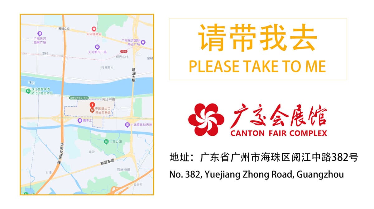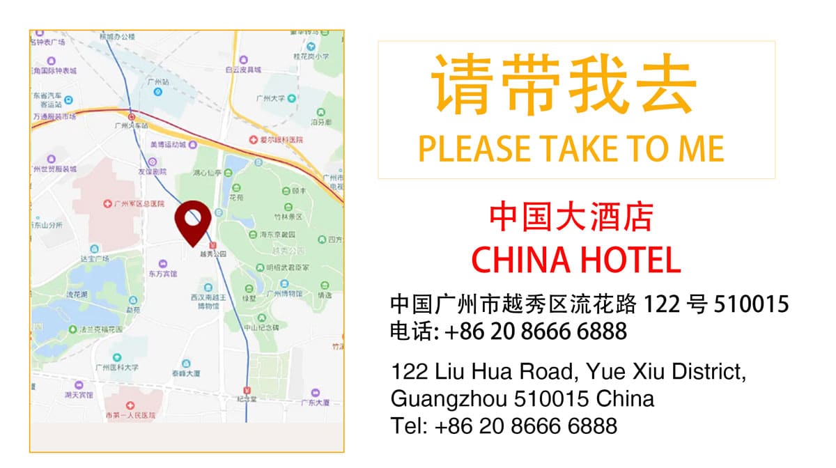 Lütfen bu kanton fuarı adres kartını telefonunuza kaydediniz. Fuara taksi ile gitmek istediğinizde taksiye göstererek rahat şekilde fuar alanına gitmenize yardımcı olacaktır.